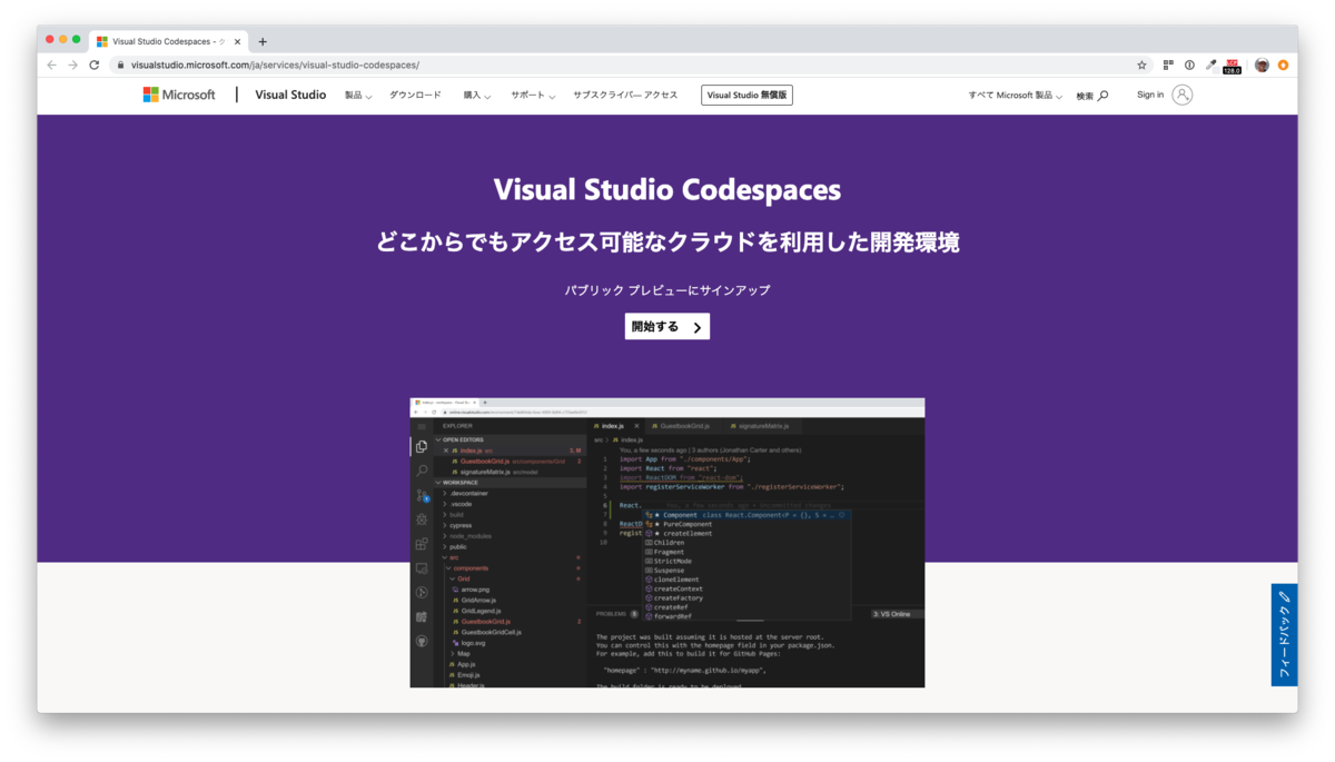 Visual Studio Codespaces - クラウド IDE - コード エディター オンライン